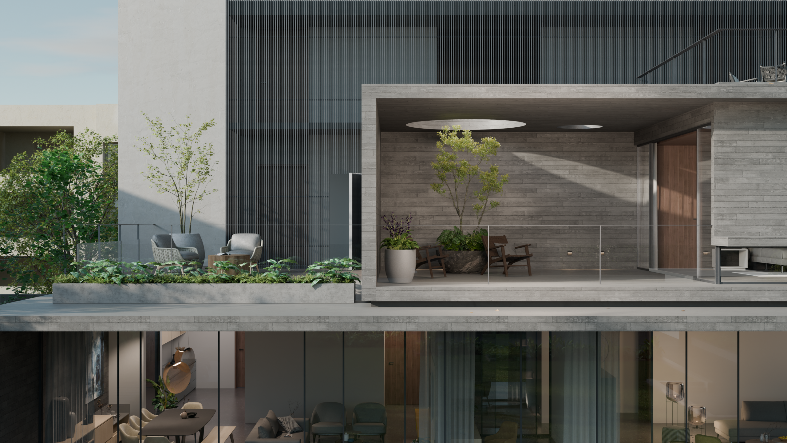 Terraces and balconies created by the home’s sliding volumes offer informal, shaded in-between spaces that enrich the daily experience and foster connection with the outdoors.