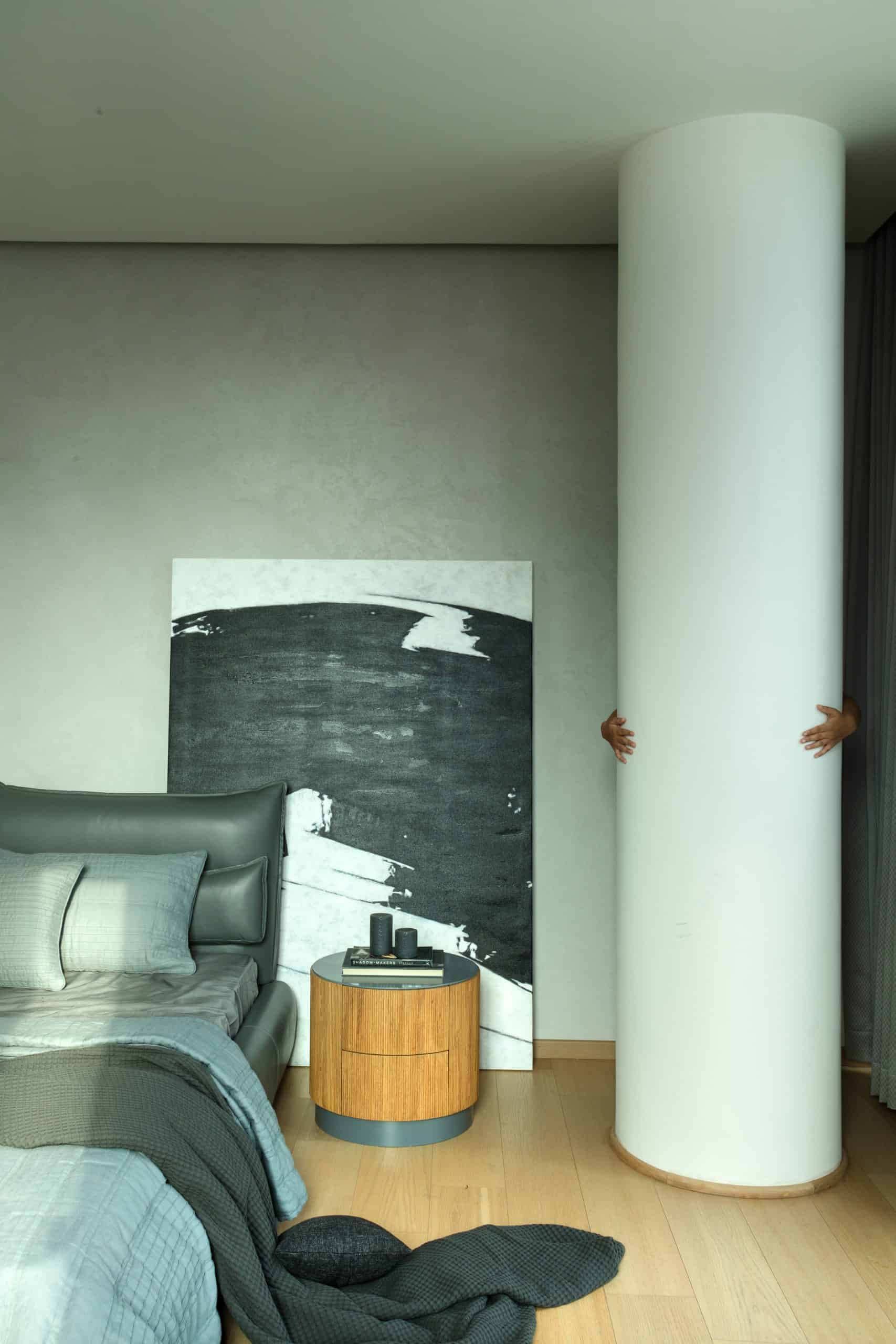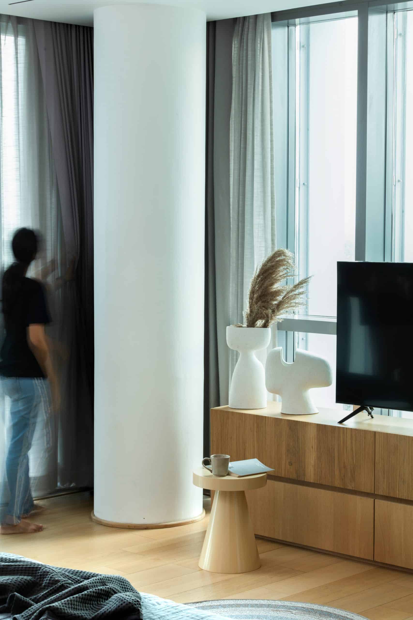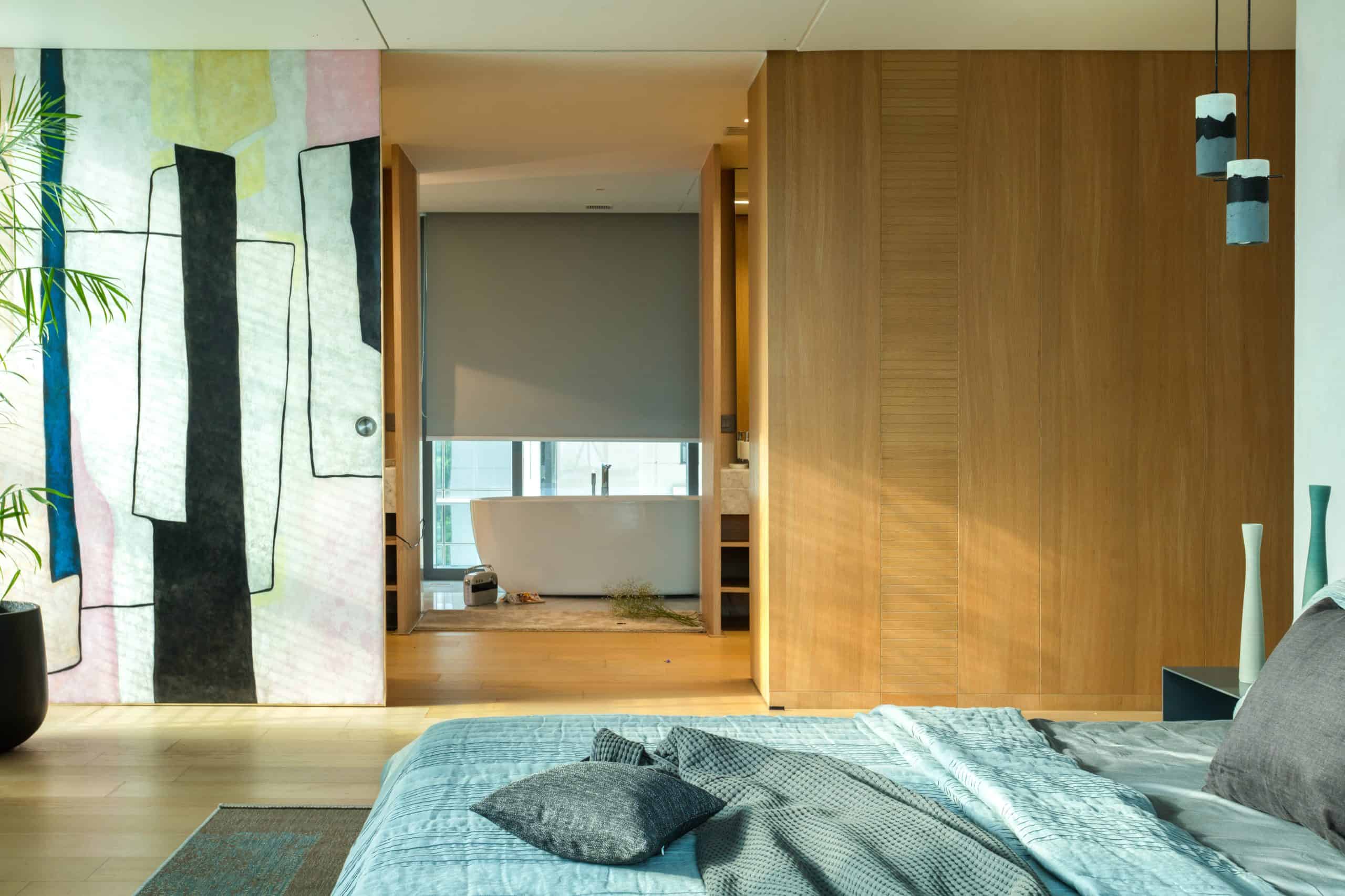 In the private zone of the apartment, a hundred feet white oak wall conceals room doors, storage units, and built-in appliances, becoming a feature that enhances the linearity of space and reduces visual clutter.