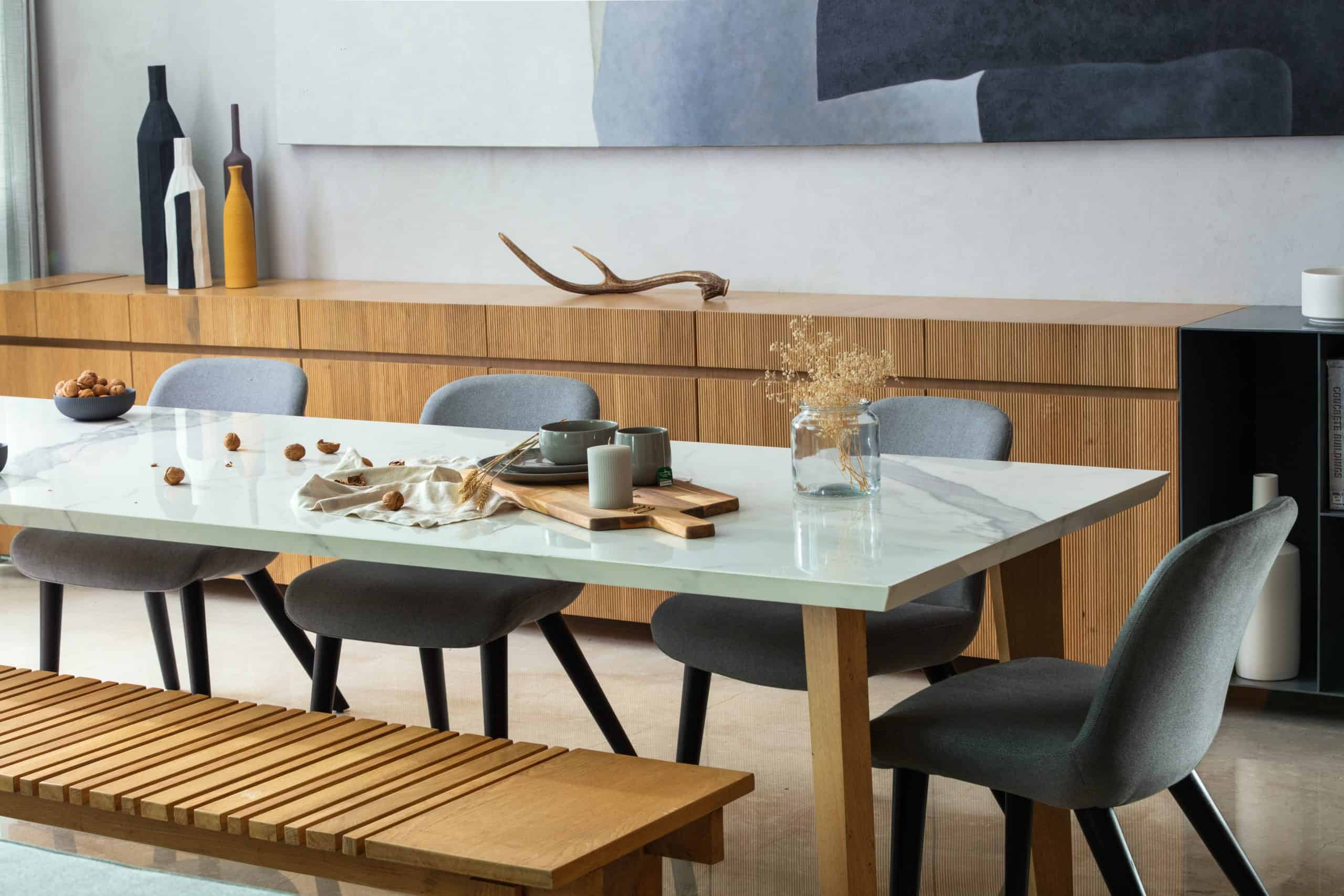 The interior spaces of the house were designed to enhance the feeling of luxury by using a neutral color palette. A combination of subtle shades of grey in the marble flooring, plastered walls, fabrics, and upholstery was used as a backdrop, while white walls and ceiling helped to create a sense of calm. Natural elements such as white oak veneer and fluted panels on wooden elements were added to bring warmth to the space.