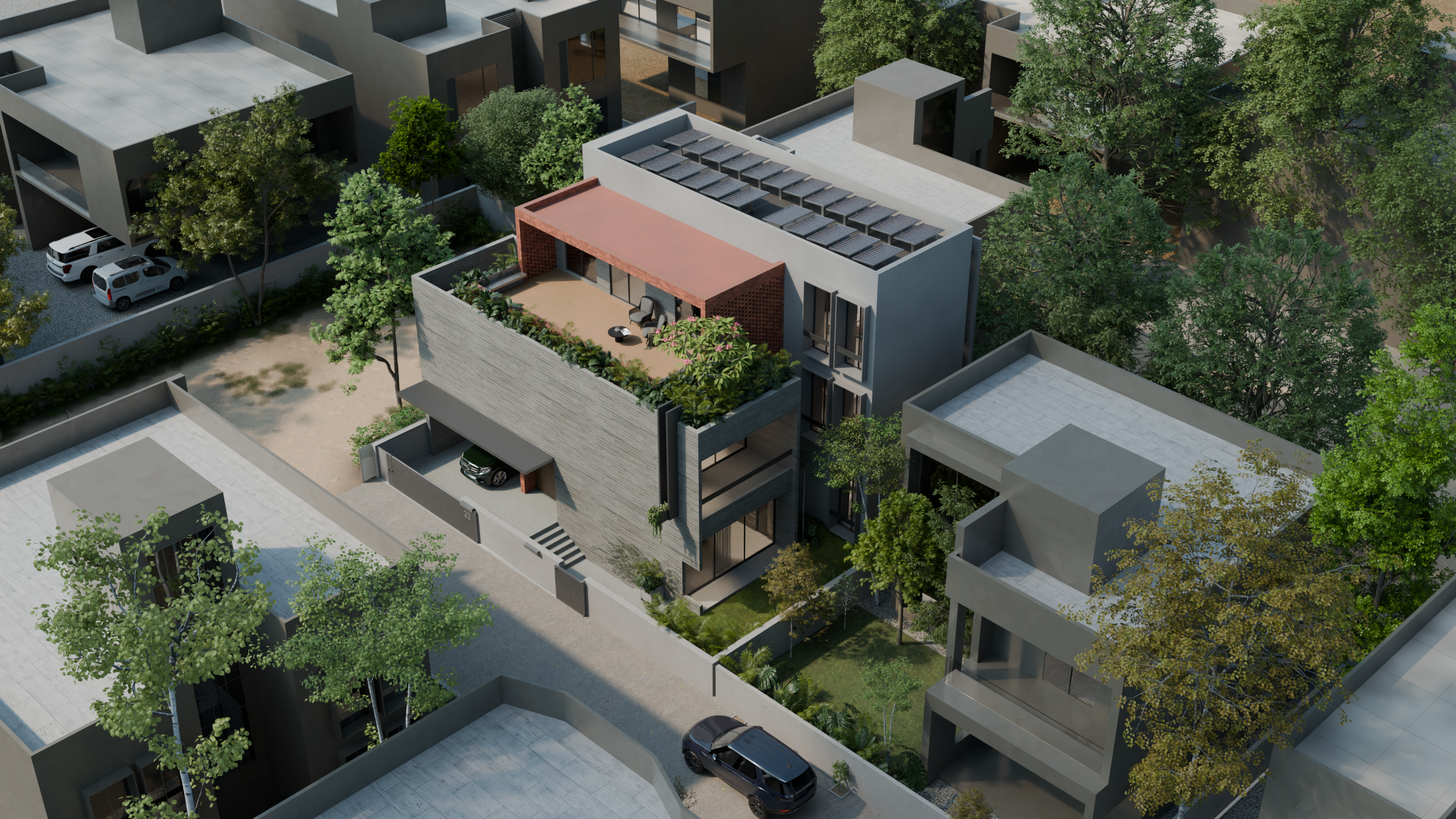 Located within a gated community in the dense urban fabric of Ahmedabad, this house is designed for a couple, their school-going son, aging parents, and a dog. Deeply rooted in the neighborhood due to years of living there, the clients wished to upgrade their lifestyle by building a modern home on their existing modest-sized plot without leaving the locality.