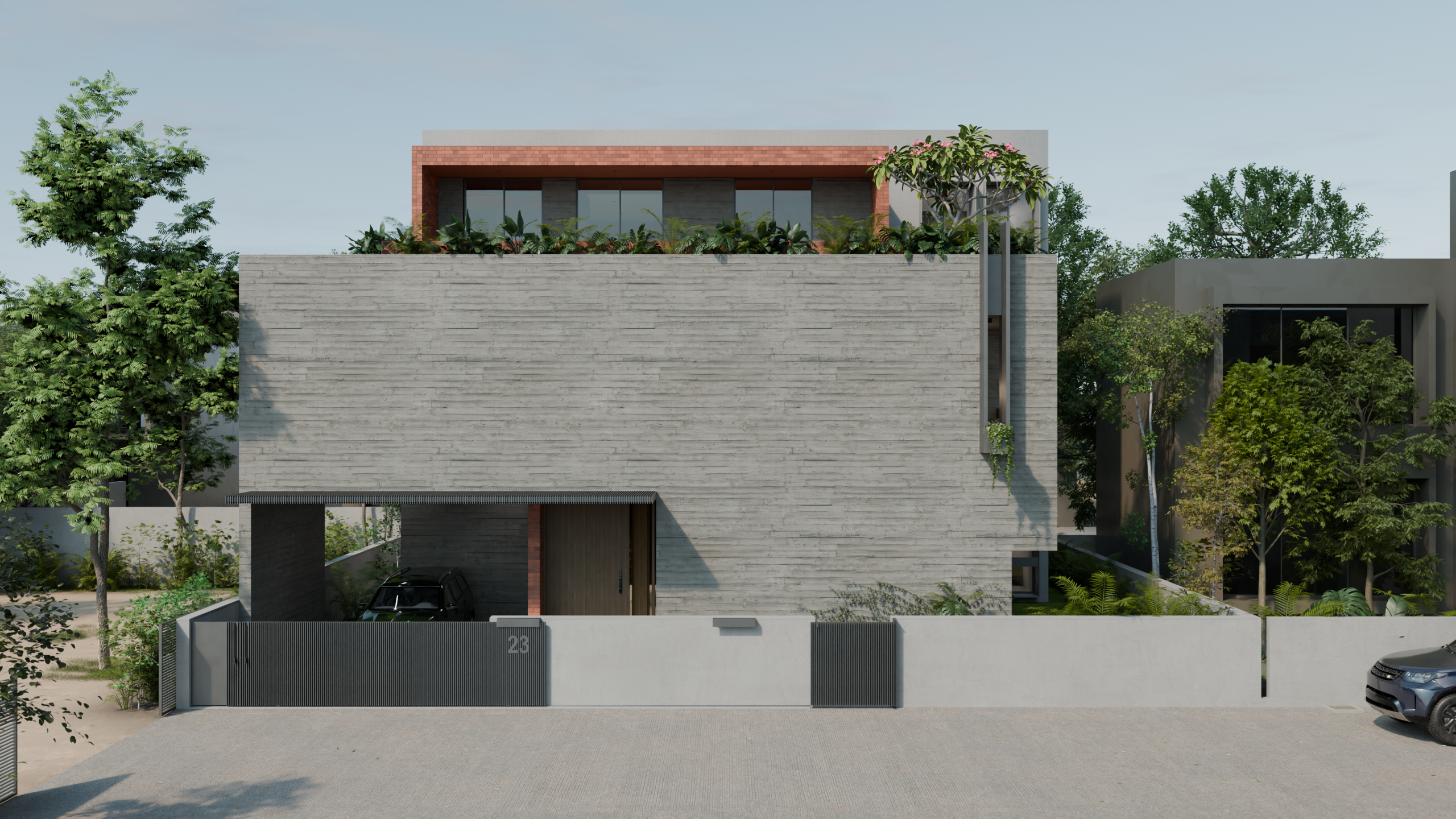 Two types of exposed concrete finish – fair finish and wood finish along with exposed brick wall and textured finishes are used throughout the house. The front block is made of wood finish concrete while the back block is made of regular plastered brick wall with textured plaster to keep a check on the budget. The front block is two storey high while the back block is three. Lower landscaped terrace on the second floor to be used for family gatherings in favorable weather conditions. The upper terrace is dedicated to solar panels and other services.