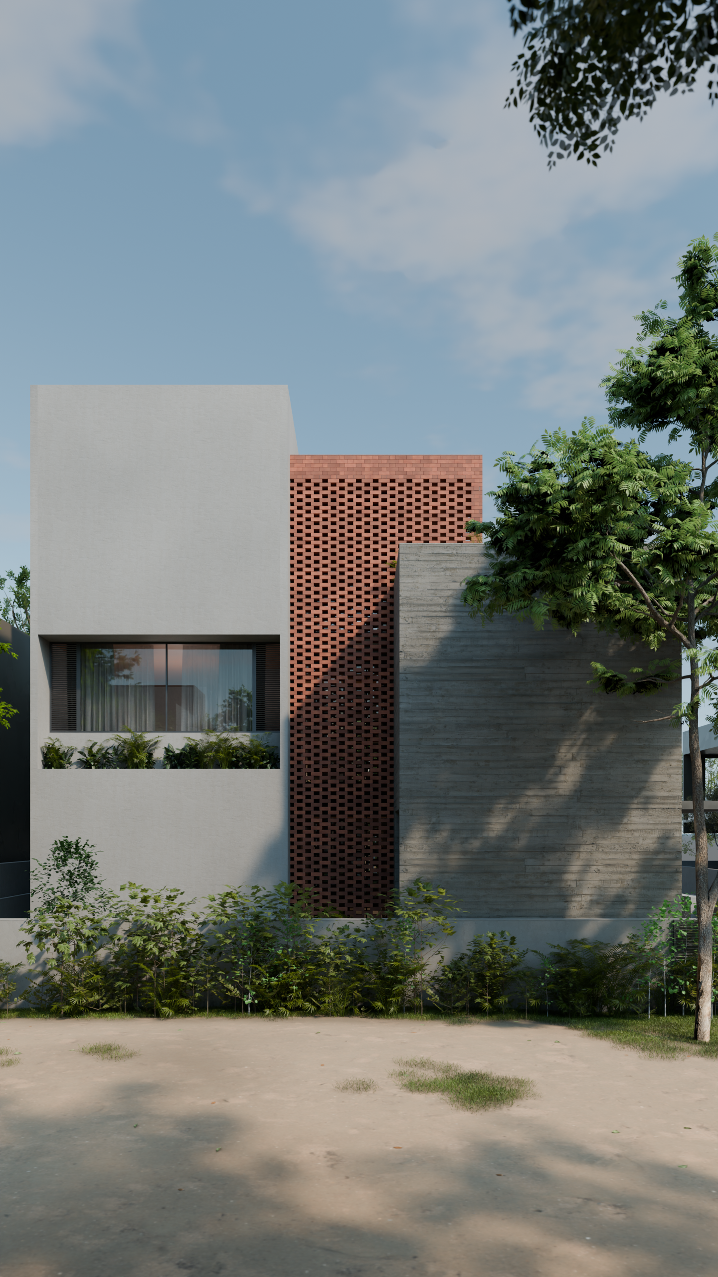 The house comprises two rectangular concrete blocks flanking an exposed brick block, with the latter acting as the heart of the design. The brick block features perforated walls on its smaller sides and houses a 2.5-story-high landscaped courtyard and staircase.