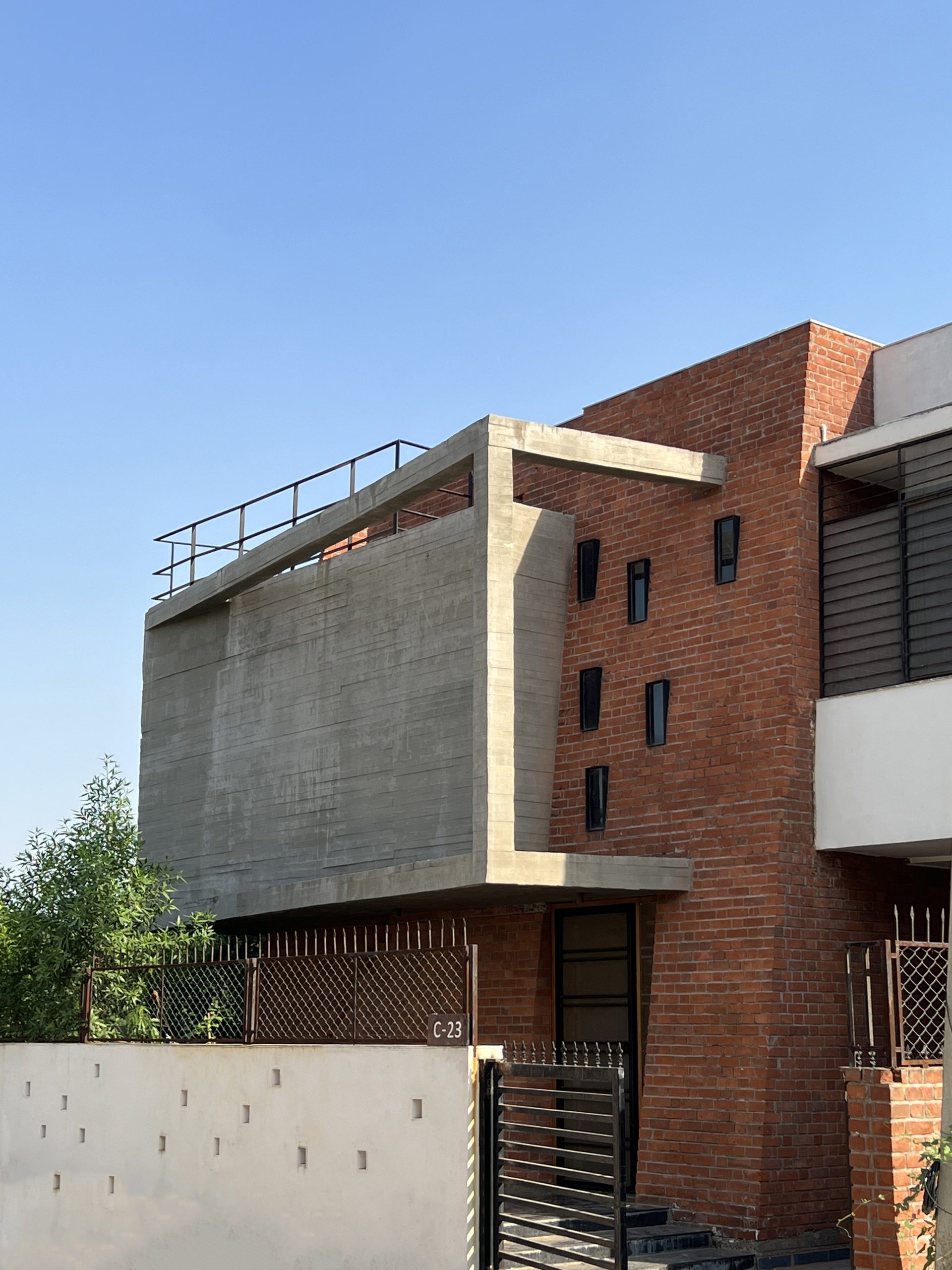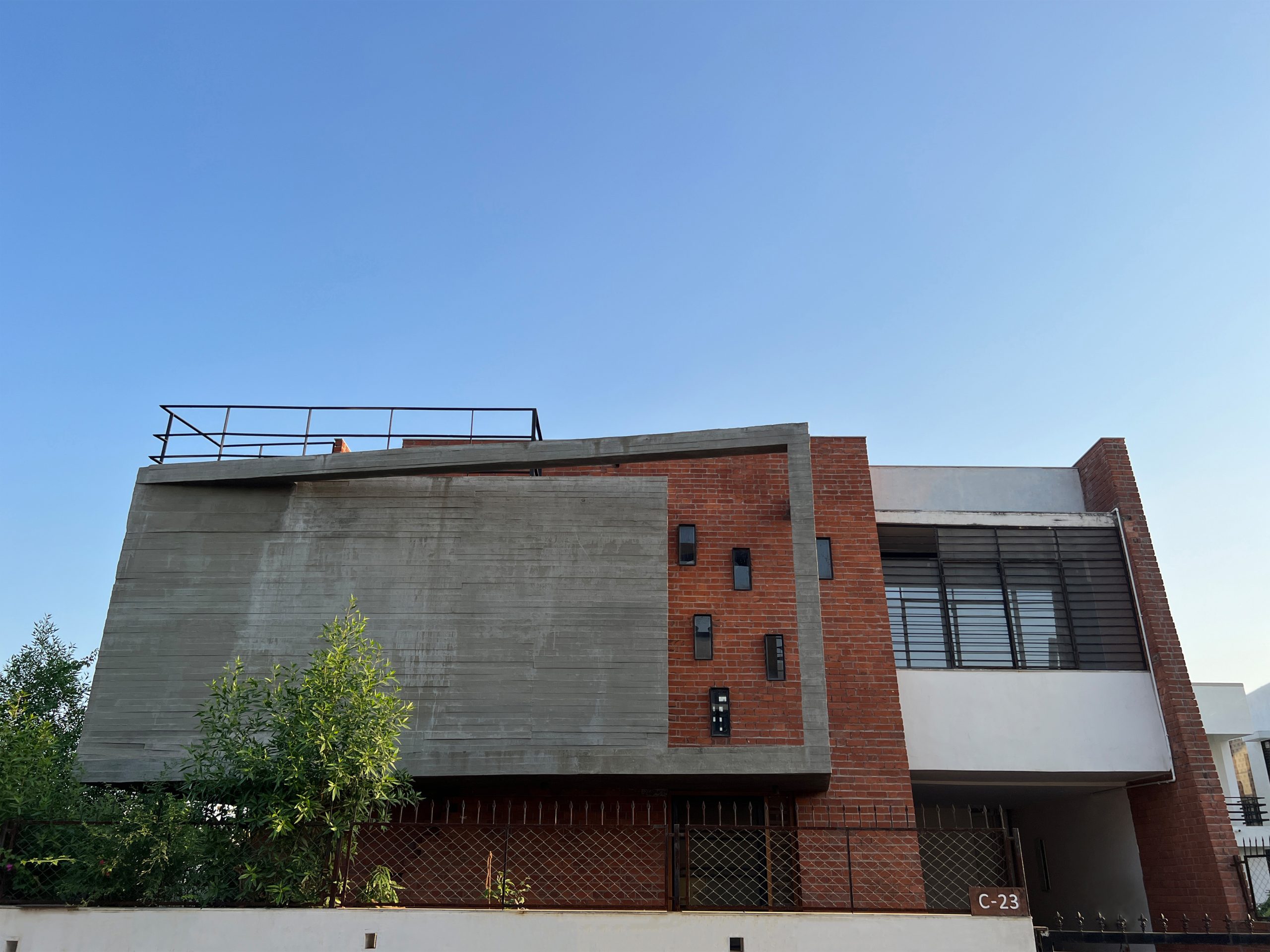 This residence explores the interplay of materials and textures in different forms and scales. Exposed brick and concrete are the main materials that create a striking contrast in the design. The residence has received a Platinum rating from IGBC for its environmental excellence.