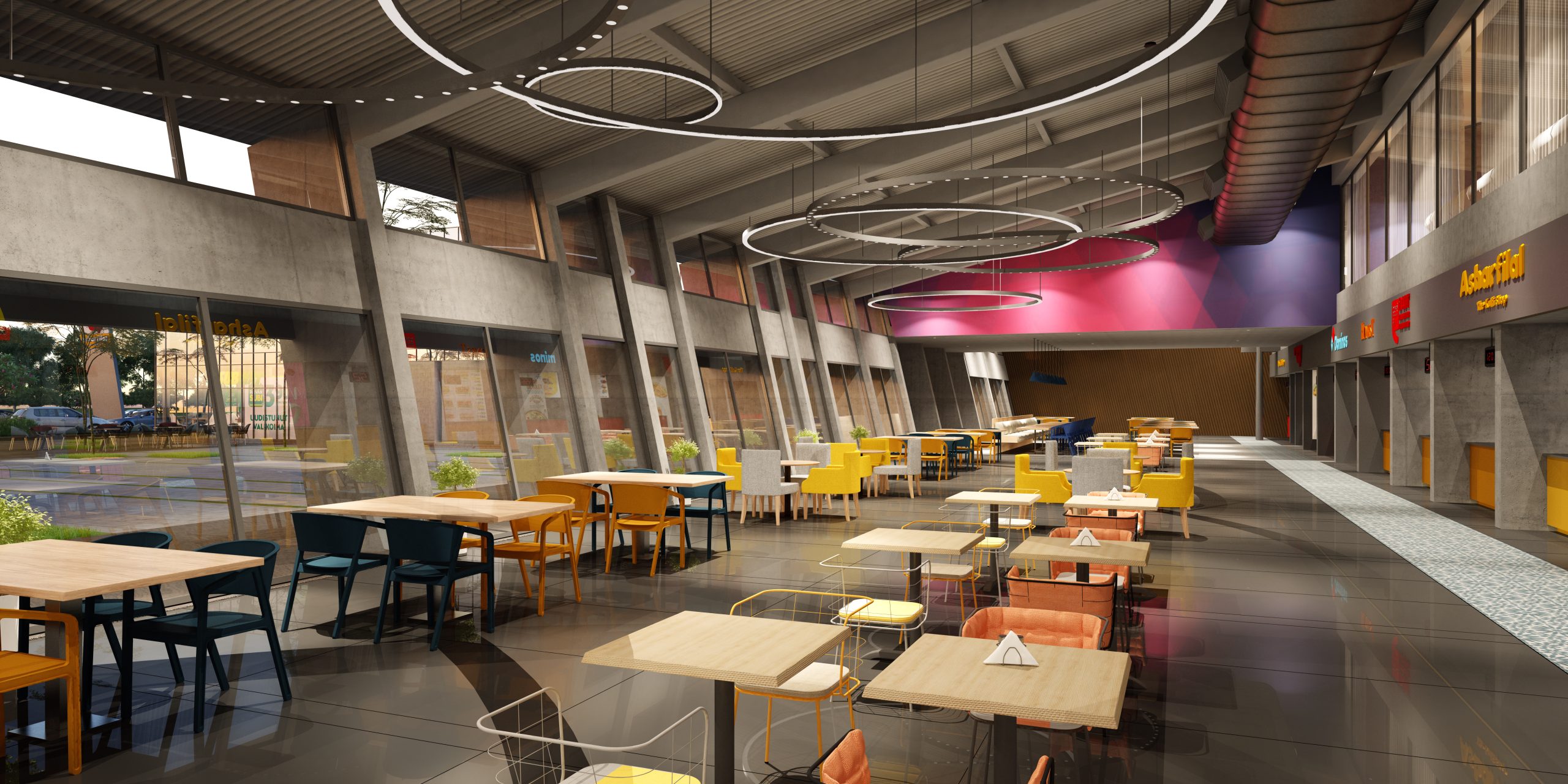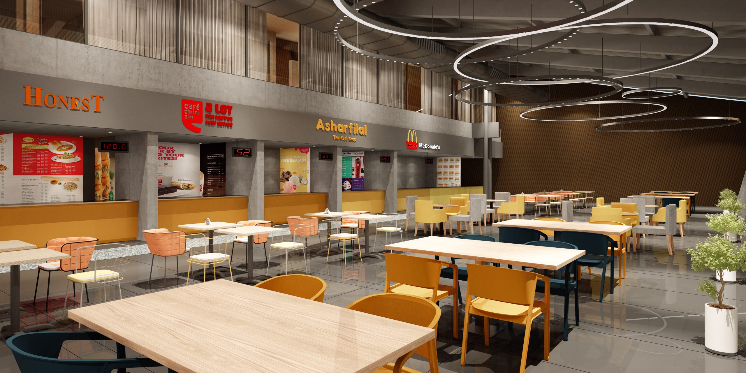 Achieving clear visibility of all available food options was one of the key aim of the interior design. The single volume interior space is divided in three different zones by intersecting linear block: Two zones of high ceiling with huge hanging lights and one zone of intimate ceiling height with cozy lighting. Food court provides various seating configurations suitable for different groups, mood, group size and preferences enabling different experiences. Large glass windows connects indoor food court with outdoor dining area and bring ample filtered day light throughout the day. Greyish blue geometrical shaped terrazzo flooring is used to define circulation path through the food court, which also separates seating areas from self serving areas.