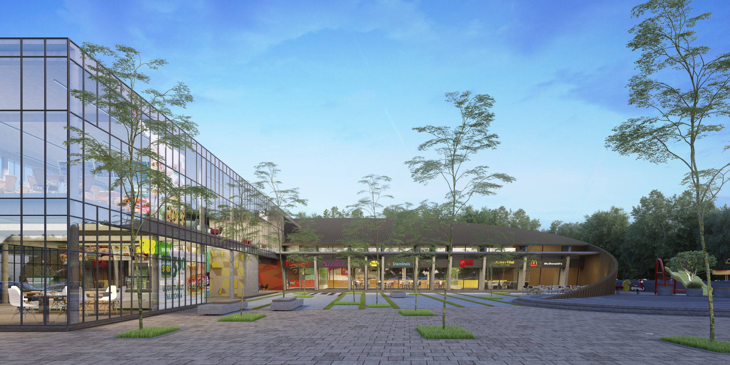An inclined metal cylinder rises from the ground creating a simple yet striking form. This cylinder is divided into two halves. One half houses an indoor food court whereas the second half is open to sky; where an outdoor seating area gets activated during evenings. A rectilinear transparent block, inserted into the cylinder, houses cafe and restaurant that are independent of the food court.