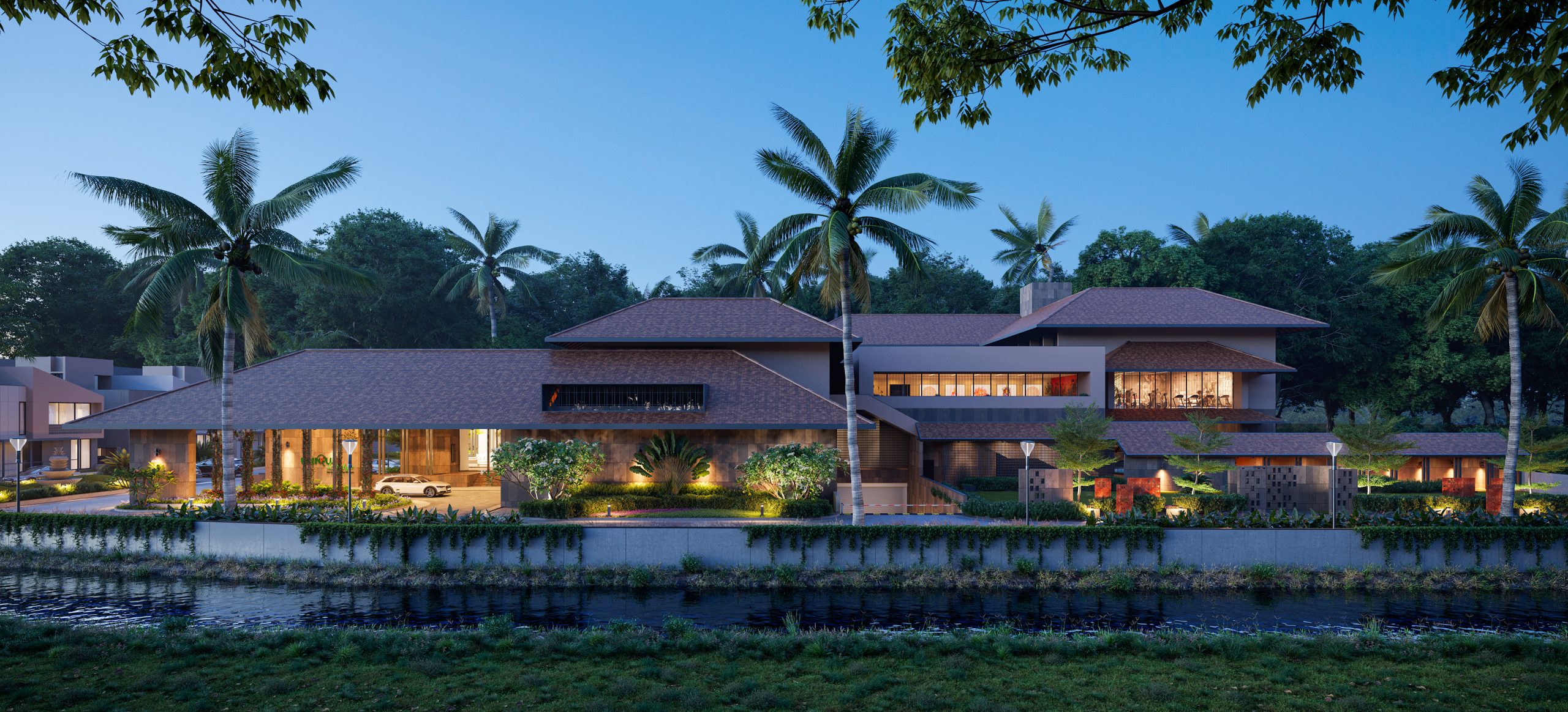 The Club faces the approach road and is pushed to the back to create space for an event lawn in front. The built form is placed around a central courtyard that caters to various activities while providing a platform for spontaneous and informal interaction. Large openings visually connect all internal spaces to the lush landscape of the premises and the farmlands beyond. It also enhances user thermal comfort by allowing maximum cross ventilation which plays a key role in hot-humid climates.